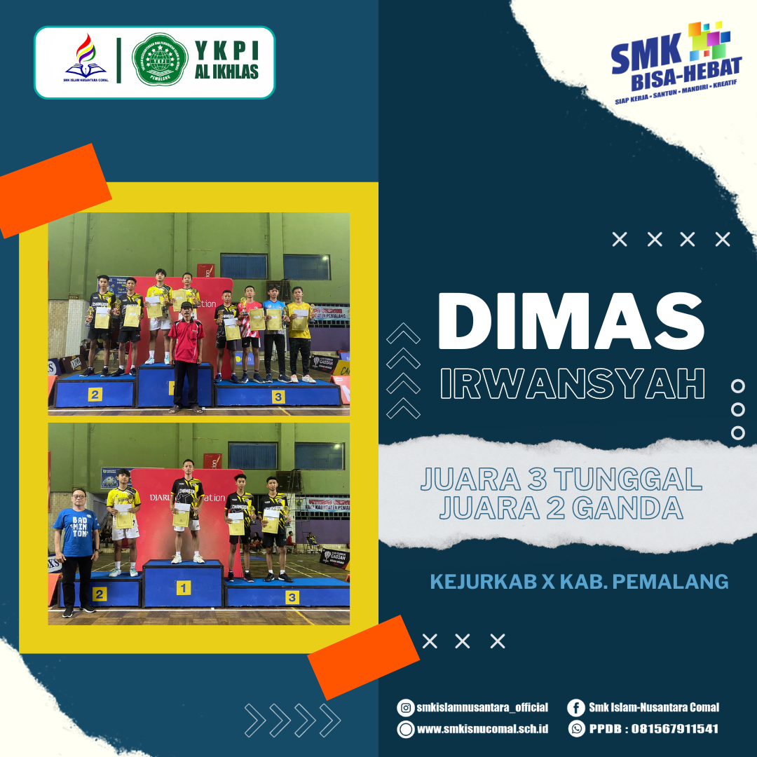 Dimas Irwansyah siswa SMK Islam Nusantara Comal Berhasil meraih gelar juara 3 Tunggal Putra dan Juara 2 Ganda Putra dalam KEJURKAB Kab.Pemalang 2023