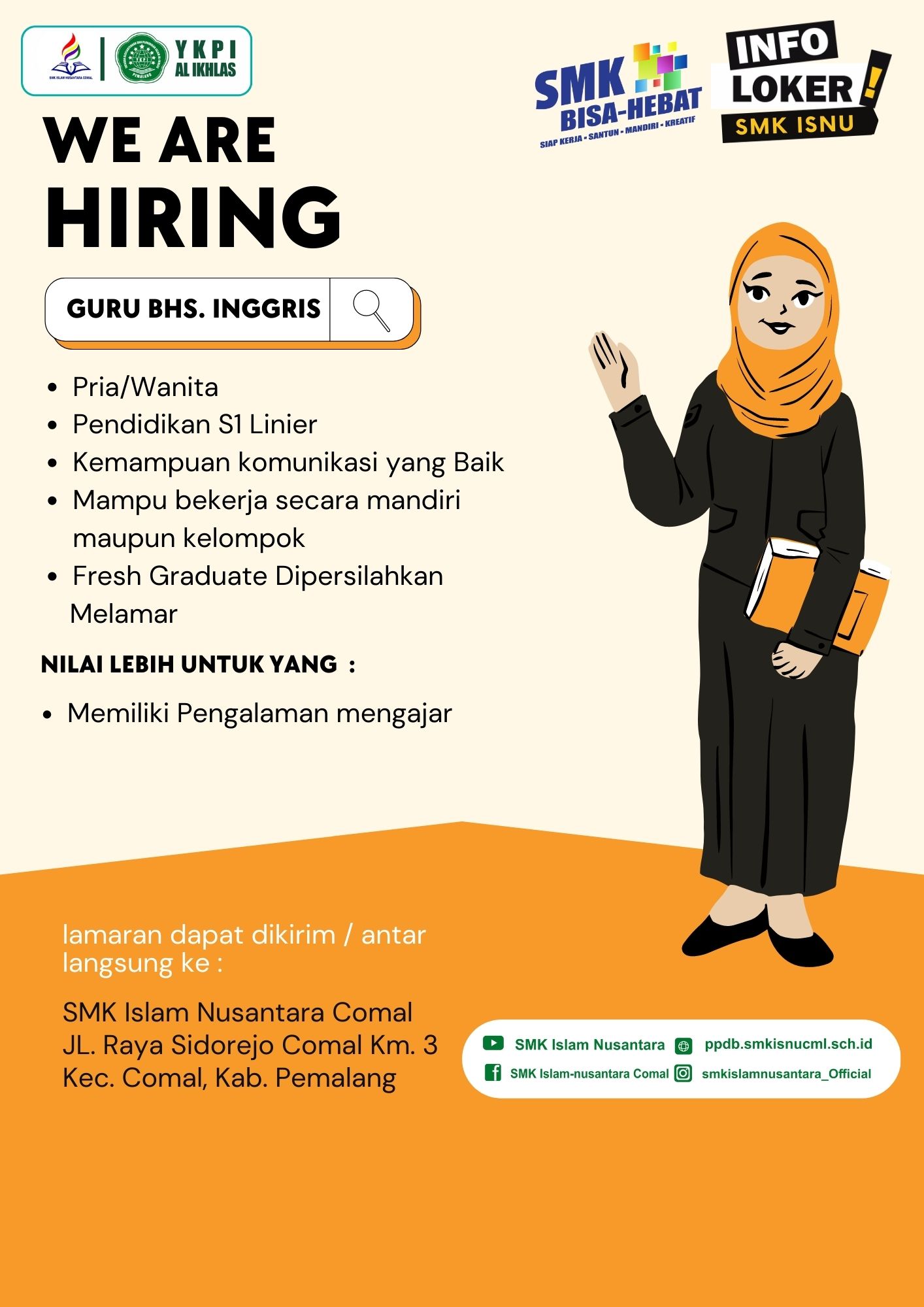 Membuka Kesempatan Bagi yang ingiin berkarir dan bergabung mennjadi Keluarga Besar SMK Islam Nusantara Comal