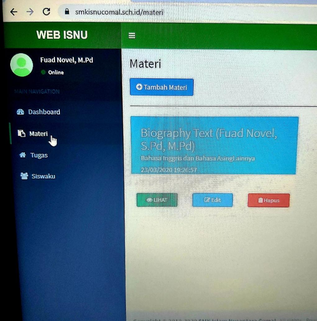 Jadwal KBM online sesuai dengan alokasi waktu KBM konvensional di kelas masing-masing. Bpk/ibu guru akan meng-upload materi dan tugas pada website sekolah, nnt siswa belajar secara online di rumah masing-masing dengan login ke akun siswa di website www.smkisnucomal.sch.id/siswa_login