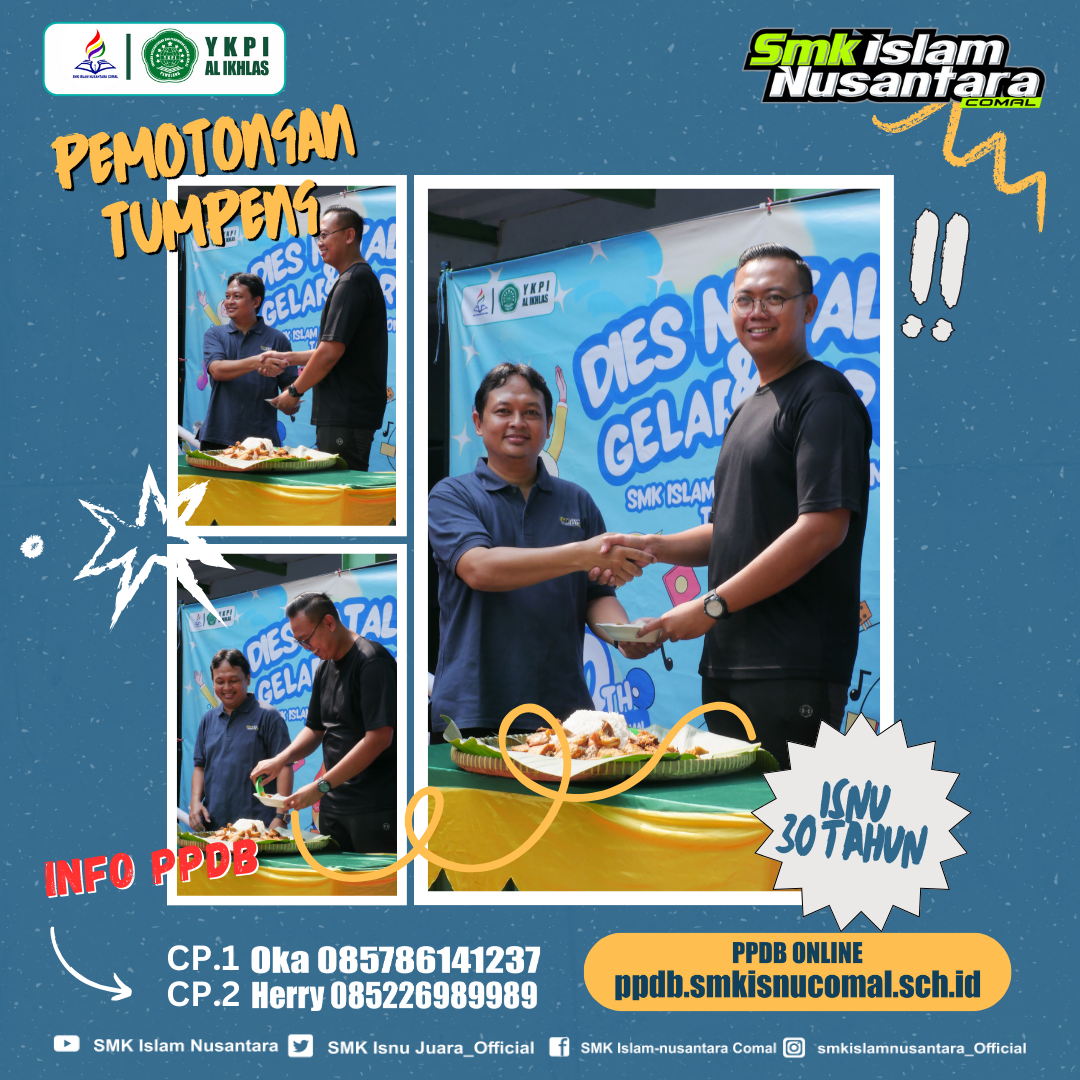 Prosesi pemotongan tumpeng oleh oleh Bpk. Galih surfatikhin, S.H kepada Bpk. Irwan Budiyanto, S.Pd selaku kepala sekolah sebagai bentuk rasa syukur SMK Islam Nusantara Comal genap berusa 30 tahun